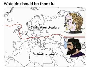 - 日耳曼欧洲文化剽窃印度-中东-非洲一带的文化,一部分印度-中东-非洲的人群又剽窃回去了日耳曼文化,每剽窃一代文化就可算作“伪人一阶”(来源虚无即一的“伪人学”),另一边日韩剽窃日耳曼和中国两边的文化也是伪人,这些说明印度文明具备社达优势,世界存在“印度化”大趋势: