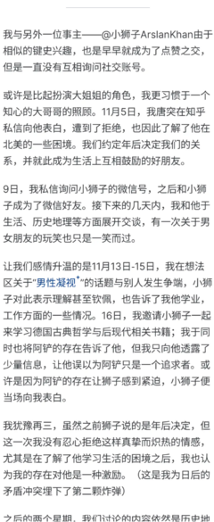 Arslan yurekli在2021年前是一名中亚伊朗历史的科普者。[28][29]2019年左右留学期间被键盘历史爱好者MTF伽蓝白夜脚踩N条船欺骗感情,可能这就是其后立场与情绪都从进步人突变到了汉保王的原因。他的想法区显示他在2019年11月4日经历了一次强烈的心理打击[30],这与伽蓝白夜残章(见右图)中“11月5日,我唐突在知乎私信向他表白,遭到了拒绝,也因此了解了他在北美的一些困境。”相符。又据伽蓝白夜残章记载,Arslan在16日因担心有其他追求者抢先向伽蓝白夜告白并被接受。然而他们的情感发展并没有这么顺利。据reddit回忆[31]记载(见右图),伽蓝白夜被爆出同时与多人发展感情并谋取钱财。12月9日,Arslan在知乎发想法宣布退乎5天,并在评论区表示“再多嘴一句,谣言杀人。有些人是好意的,有些人是恶意的,总之不要轻信身边的人。周末见”[32]12月22日知乎问题“如何看待大 V 伽蓝白夜利用网恋骗感情骗钱相关文章?”出现,问题日志显示了Arslan写的《大V@伽蓝白夜GaraNakt的骗情骗财史》。[33]笔者在以前看过这篇文章,但现在已经被删了。2020年5月13日,为向另一名受害人道歉,伽蓝白夜注销了自己账号。你销号了我们考古什么啊(悲)[34]2021年Arslan开始与Obbedisco走近。2023年7月30日发表想法指控“唐吹的本质是改革开放初期‘拜日耳曼但又不想彻底否定自我’的产物”[35],彻底转向日耳曼学;此后知乎反对者对其最常见的指控也正是Arslan前后“人设矛盾”。但实际上从左派转向成右派的并不少......现在(2026年)又被多方真的多批评长期随意高强度“预防性拉黑”他人,包括大量立场有冲突的知乎用户;但不限于此,甚至于有些人根本没搞懂自己为什么会被拉黑。